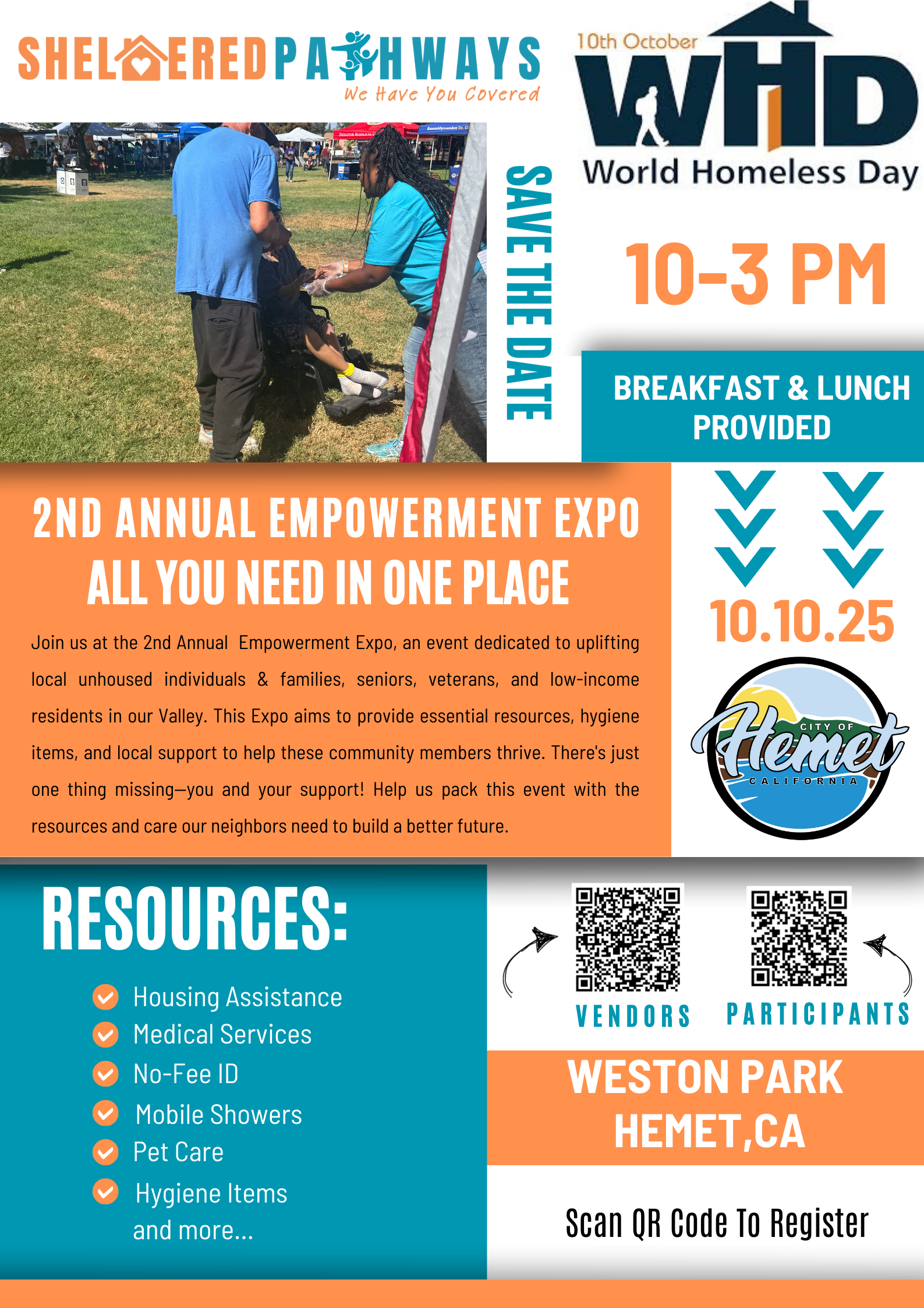 As part of its mission, Sheltered Pathways hosts one of the largest Outreach Expos in Riverside County each year on International World Homeless Day 10/10 every year, uniting service providers, community leaders, and resources to directly support those in need.